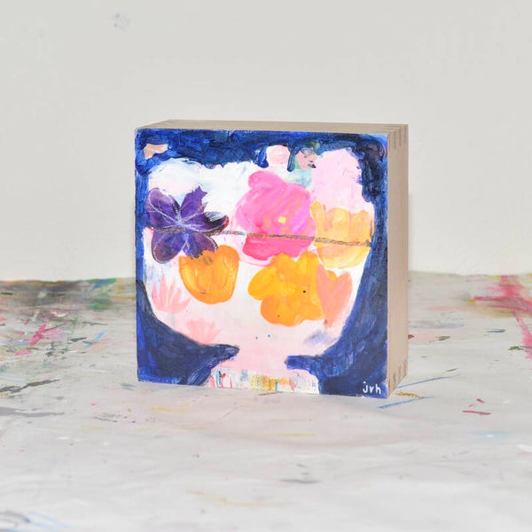 Gemengde techniek op diep houten paneel/blok, dat zowel aan de muur kan worden gehangen, als staand kan worden gebruikt.